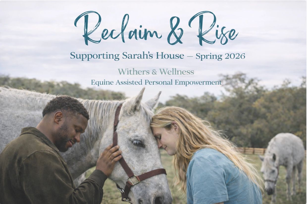 Withers & Wellness is excited to introduce Reclaim & Rise, a new pilot initiative created in partnership with Sarah’s House. This program offers professionally facilitated, ground-based equine-assisted personal empowerment sessions designed to support individuals experiencing homelessness and significant life transitions. Through guided interaction with horses, participants build confidence, strengthen resilience, and develop practical skills to help them move forward with clarity and purpose.